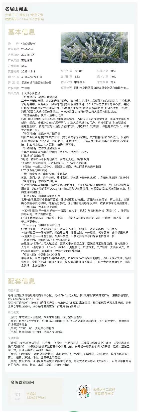名居·山河里地處深圳東部中心重點區域橫崗,占位深圳東進戰略橋頭堡,是連接龍崗東西部的中間點,被譽為龍崗的“腰桿子”,執掌大運新城中心門戶。橫崗將打造“科技智造城,創意生活谷”,優勢產業與大運新城協同發展,周邊19個舊改項目,體量超300萬㎡,未來生活全面升級。
