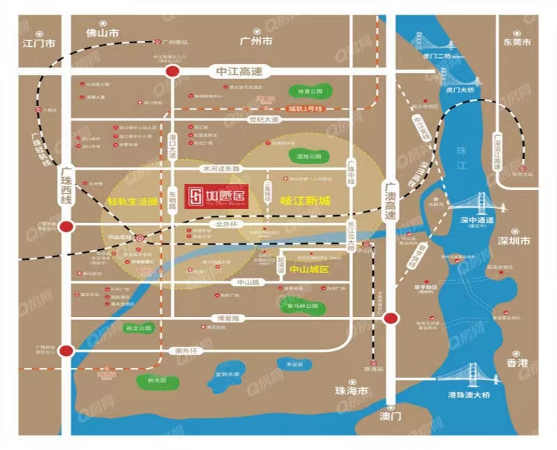 如愿物業 優質貼心服務岐江新城內,鄰近三角快線。無論是通過三角快線接駁長江路前往中山東區,還是前往三角、黃圃等中山北部鎮區都比較方便。挨深中通道港口出口,距離中山北站3公里,距離中山站6公里,粵港澳一小時生活圈!華南師范大學中山附屬中學,中山市華僑中學(高中部),港口鎮中心小學,中山市實驗小學,港口理工學校,中山市石岐中學,電子 科技大學中山學院(富麗路),卓越博達教育(港口校區),港口中學,華南師范大學中山附屬小學。醫療: 中山市第二人民醫院,中山市港口醫院,港口濕地公園,港口中心公園。項目距離保利廣場、萬民匯商圈約2公里,距離正在開發建設中的寶龍城綜合體、中山108綜合體也只有約3公里。